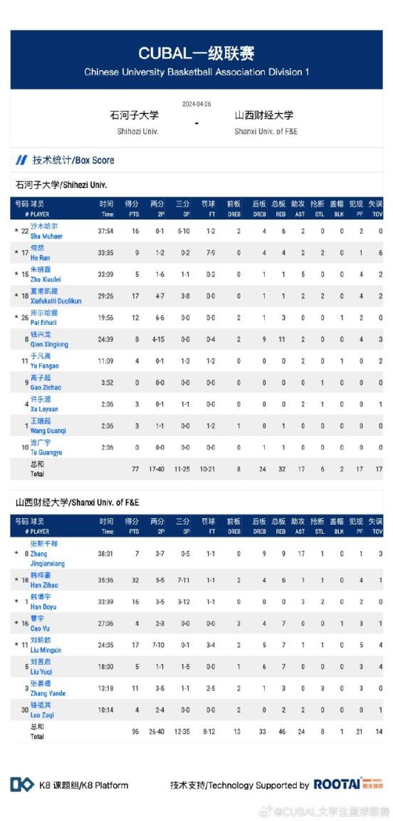 石河子大学:夏甫凯提17分2助攻,沙木哈尔16分6篮板2助攻,排尔哈提12分3篮板,何然9分4篮板2助攻,钱兴龙8分11篮板2助攻