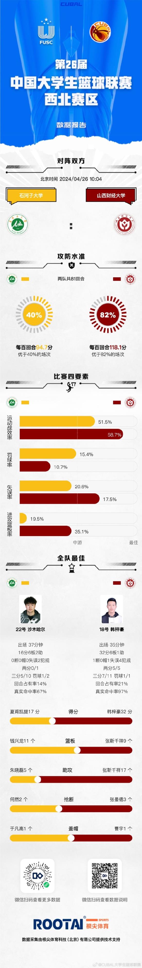 4月26日讯 CUBAL大学生篮球联赛西北赛区5-8名排位赛,石河子大学对阵山西财大。