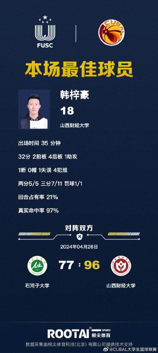 山西财大:韩梓豪32分6篮板,刘明歆17分7篮板,韩博宇16分3助攻,张晏德11分3篮板3抢断