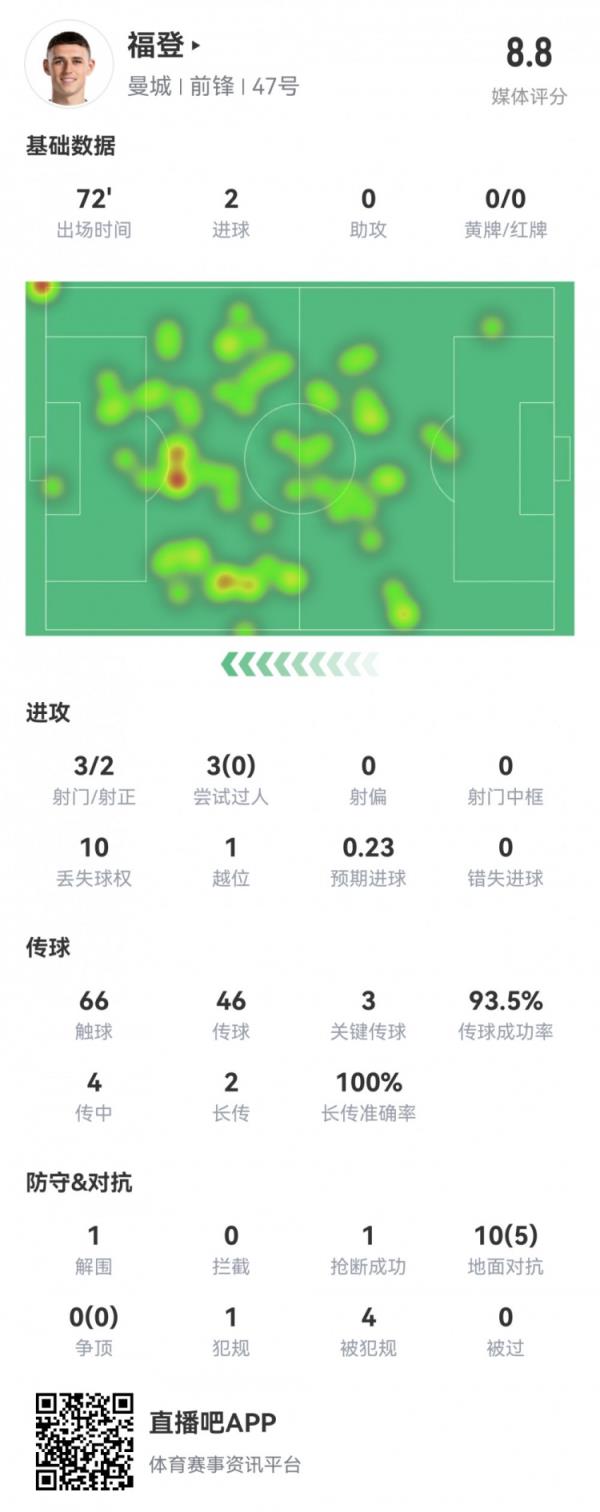 - 福登本场数据:2粒进球,预期进球0.23,3次关键传球,评分8.8