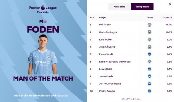 本次票选共有15440次有效投票,其中福登以78.7%的得票率以绝对优势当选全场最佳,排名第二的德布劳内获得10.3%的投票,第三的沃克为5.0%。